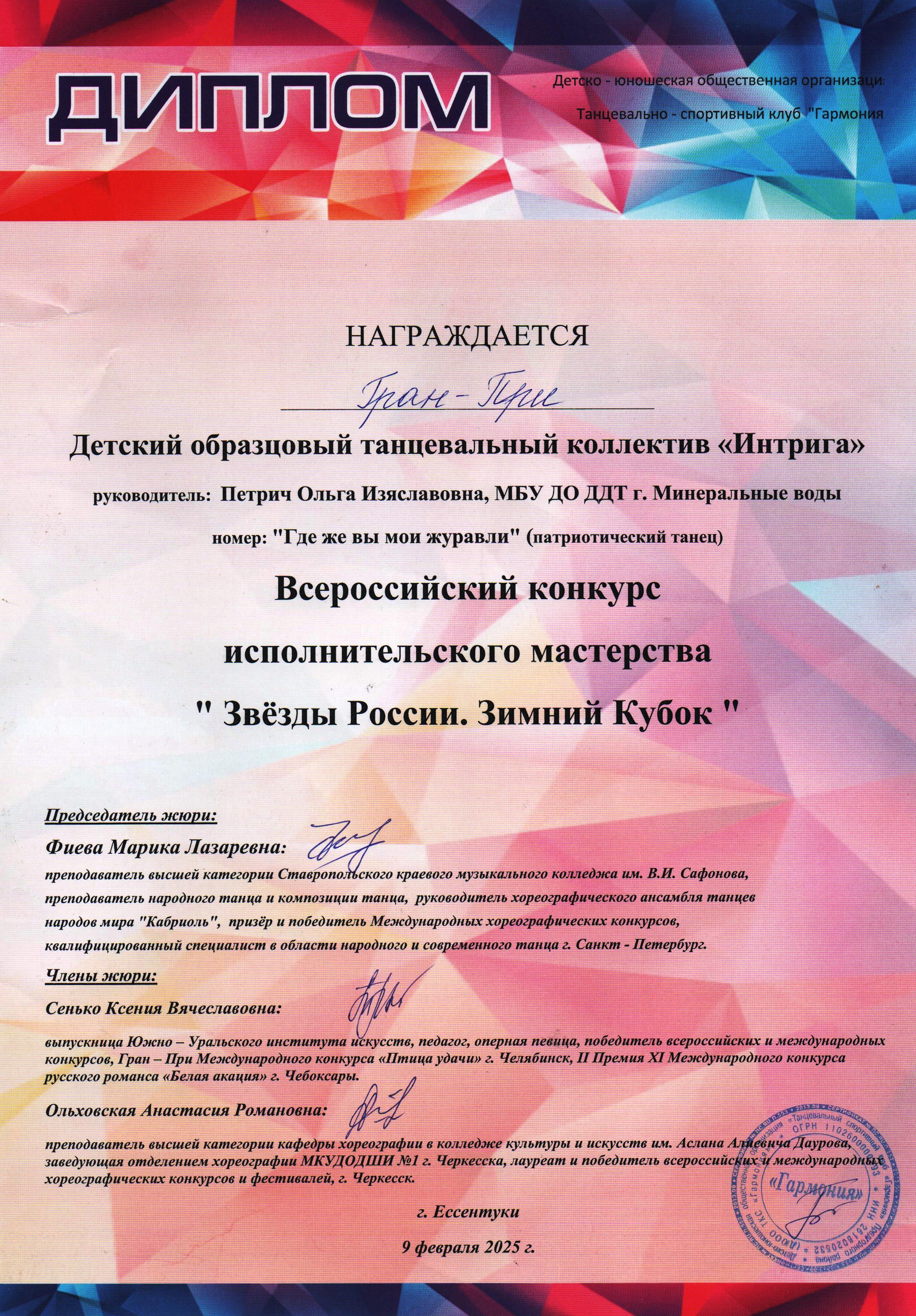 Всероссийский конкурс исполнительского мастерства "Звёзды России. Зимний Кубок" 9.02.2025 г.